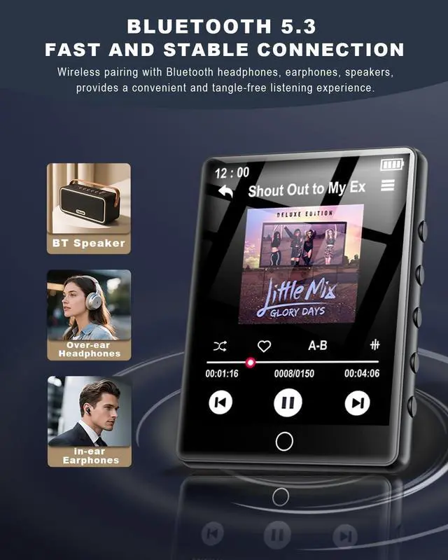 Bluetooth 5.3MP 3 player bluetooth features Bluetooth 5.3 technology, offering 45% faster data transfer speeds, longer connection distances, and stronger anti-interference capabilities. With lower power consumption and enhanced energy efficiency, it ensures seamless connections with Bluetooth headphones and speakers. Supports various music formats including MP3, WMA, APE, FLAC, WAV, and AAC. ^^ 128GB Large MemoryPortable MP3 player comes with 128GB of built-in memory, capable of storing thousands of songs, creating a mobile music library that lets you enjoy your favorite music anytime, anywhere. Additionally, the player supports up to 128GB micro SD card expansion, meeting your needs for more storage of music, pictures, and audiobooks, enriching your musical world.