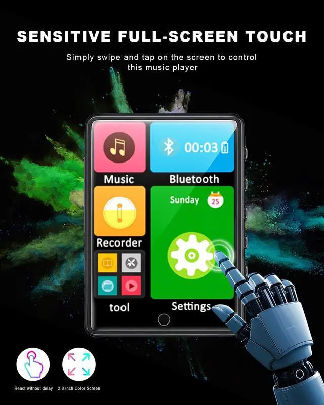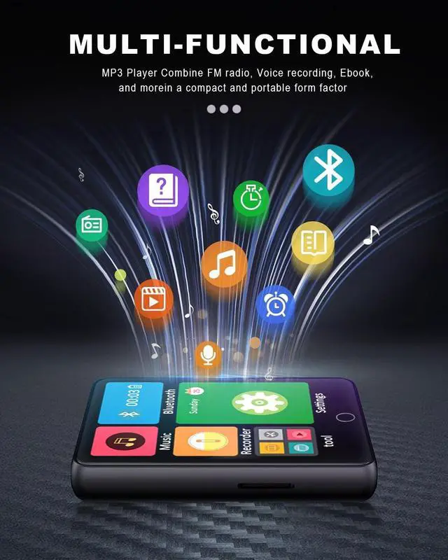 ^^ 2.8 -Inch TouchscreenMP3 music player features a 2.8 -inch large touchscreen, offering responsive and easy operation. Whether browsing songs, pictures, or reading e-books, the touchscreen provides a smooth user experience, allowing you to enjoy multimedia entertainment effortlessly. ^^ HiFi Lossless SoundOur MP3 player integrates built-in high-definition speakers and premium chips, allowing you to enjoy lossless HiFi sound quality to the fullest. Experience clear and lifelike music without earphones, freeing yourself from constraints and immersing in the joy of music. With advanced technology and high-quality chips, every note is delivered crisply, ensuring an immersive high-quality audio experience.
