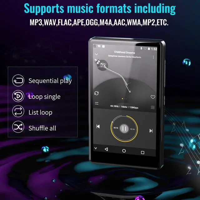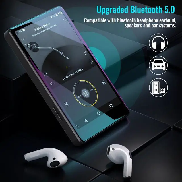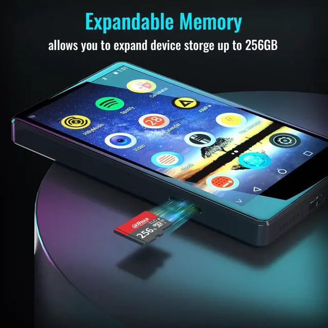 MP3 Player with Spotify-The android based music player pre-installed with many of the most popular apps, Spotify kids, Spotify, Music, Audible and HiBy Music, etc. it is compatible with most music formats, including MP3, WAV, FLAC, APE, OGG, M4A, AAC, WMA, MP2, etc., and provides various song categories, such as Title, Folder, Artist, Album, etc. ^^ Bluetooth and WiFi-The player comes with Bluetooth and WiFi, which is compatible with a wide variety of Bluetooth devices, such as earphone & headphones, speakers, car stereos, and provides fast pairing and stable connections on both bluetooth and WiFi.