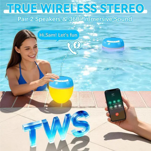 swim or party ^^: Why settle for one floating bluetooth speaker? this hot tub speaker delivers more than background tunes Pair two to create stunning true stereo surround sound that fills your entire pool area. Feel the music wrap around you with crisp highs and rich bassperfect for turning casual gatherings into epic pool parties, outdoor movies, or gaming nights. This is sound, amplified and synchronized, just like a professional outdoor audio system ^^