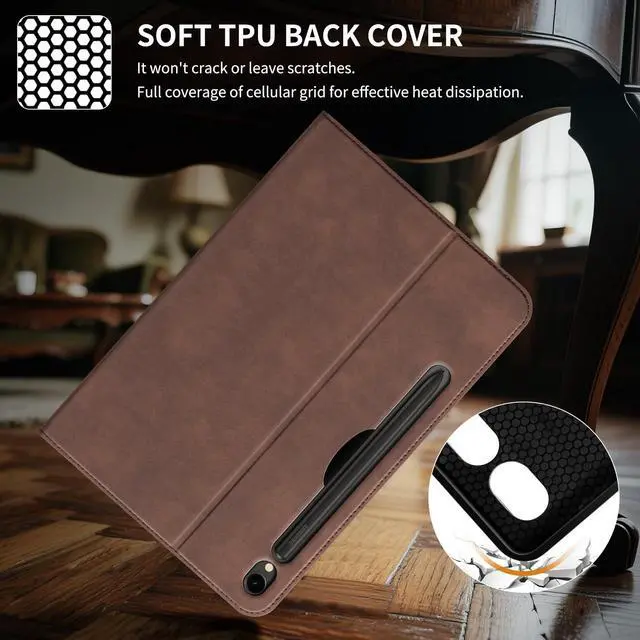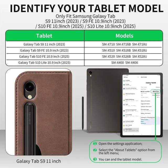 [Compatibility]:This leather protective case designed for 2023/2025 samsung galaxy tab s9 11 inch and s9 fe/s10 fe/s10 lite 10.9 inch(model:sm-X710/X716B/X718U/X510/X516B/X518U/X520/X526B/X528U/X400/X406) Note:It will not be compatible with other tablet models,please check the model of the tablet computer.This leather case has a built-in pen holder but does not include a pen.