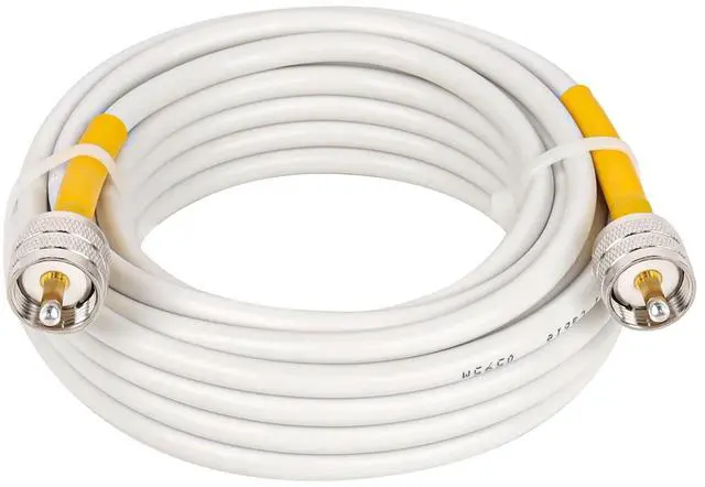 ^^ Premium Materials -- The inner conductor of this cb antenna cable is made of solid copper, and the outer conductor is made of Aluminum foil and tinned copper braid which could maximum protect the signal over large distance. More than 95% shield performance, 95% resistance to EMI and RFI. Waterproof and flexible white PVC jacket allows the cable exposure in outdoor harsh environments. ^^ Stronger Connection -- The length of heat shrink tube that connect the rg8x cable and pl259 male connector is upgraded to 2.2", which can better protect the connector from falling off.