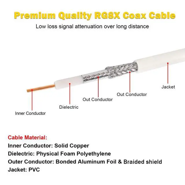 Applications -- This cb coax cable is widly used for vhf marine antenna, cb radio, ham radio, vhf radio, antenna analyzer, monitor, tuner, dummy load, SWR meter and ect. White marine coax cables are designed for use on boats and anytime a black colored cable isn't needed. ^^ Ultra Low Loss -- MOOKEERF rg8x coaxial cable(also called Mini-8) is a step up from standard RG58 coaxial cable. Its signal loss is much lower than rg58 cable. It could support better signal transfer with minimum signal loss over large distances and higher frequency use.