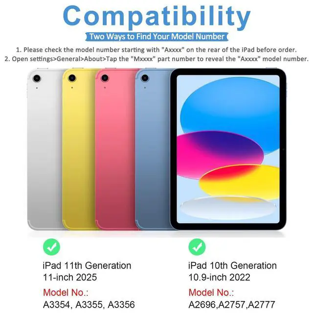 Compatibility Model: This iPad case keyboard with mouse is designed for iPad 11th Generation (A16) 2025 11 inch (A3354/A3355/A3356) and iPad 10th Generation 2022 10.9 inch (A2696/A2757/A2777 ). NOT compatible with any other 10.9 inch or 11 inch iPad models. Please check the back bottom of your iPad to find the model number before placing order. (Not includes iPad and Pen!!! ).