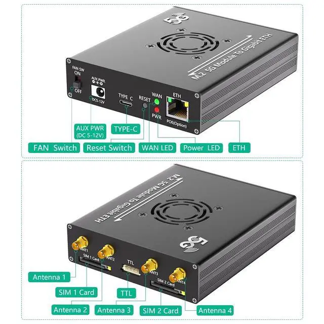 • 5.Package contents: 1x M.2 to Type C adapter, 2x M2 Screw, 4x M2.5 screw, 1x screwdriver, 4x 2.4G/5G antenna, 1x TTL 4Pin Cable,1 x grommet Kit, 1x SIM Card Extension Kit,1x Type C cable.