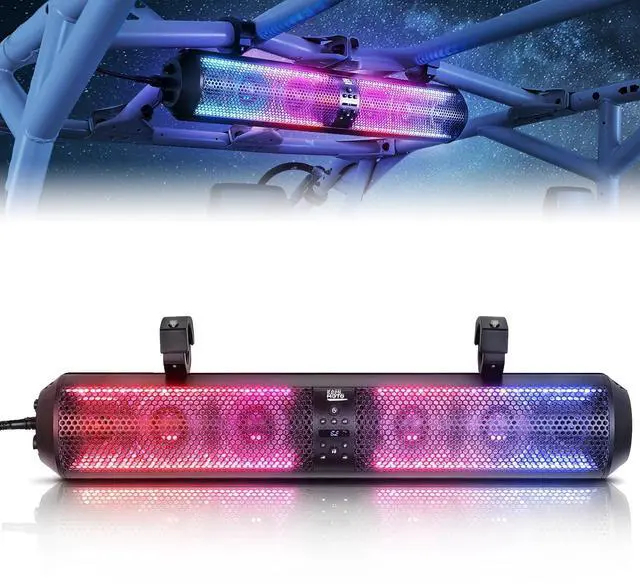 Complete Setup Included: With the package of kemimoto Bluetooth RGB speakers, you'll receive everything you need for a easy installation. This includes adjustable mounting brackets, a 28" 6-speaker loud soundbar, AUX input, USB jack, wireless remote control, power extension adapter, cigarette lighter, user manual, and installation tools. Multi-Angle adjustable Clamps fit roll bars from 1.56 to 2.25. KEMIMOTO speakers are for 12 Volt Vehicles. Great for UTVs, ATVs, and Golf Carts. Compatible with Polaris RZR CFmoto Zforce Can-Am Maverick X3 Maverick R Defender ^^ Round Design with