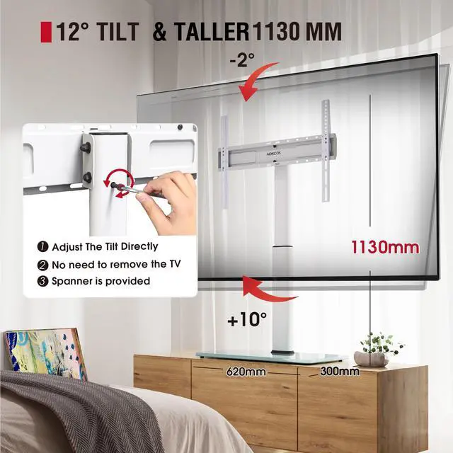 Tilt Adjustment: -2-10Tilt function allows you to level your TV, it is worth mentioning that we upgraded the way of adjusting Tilt, you only need to turn the long screw on the back of the 85 inch TV stand to adjust the angle easily, instead of needing to unscrew several different screws like other TV stands ^^ Adjustable Height