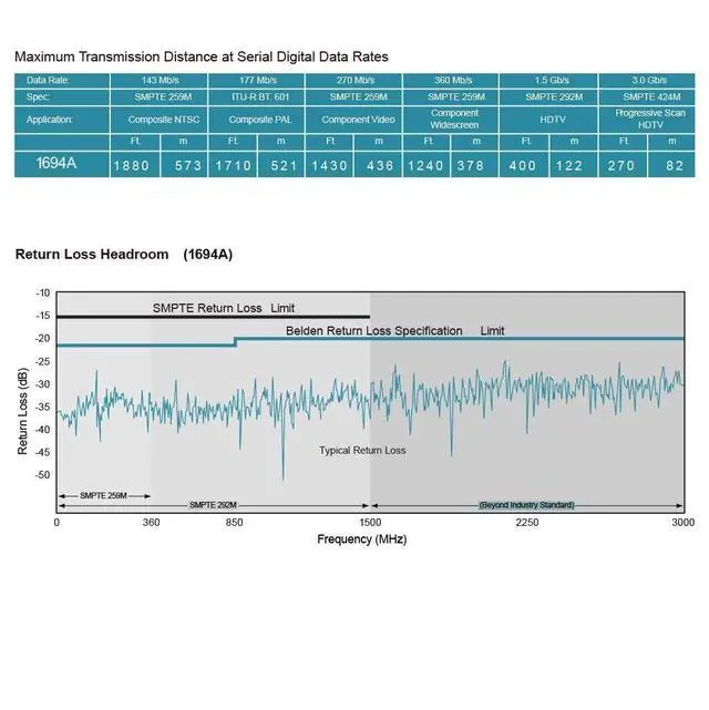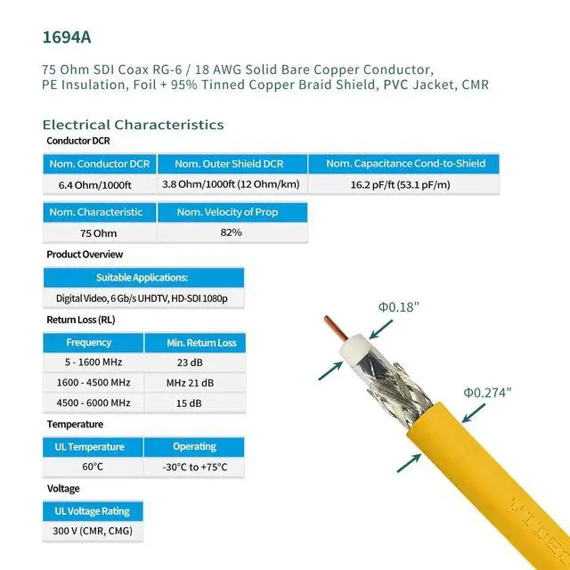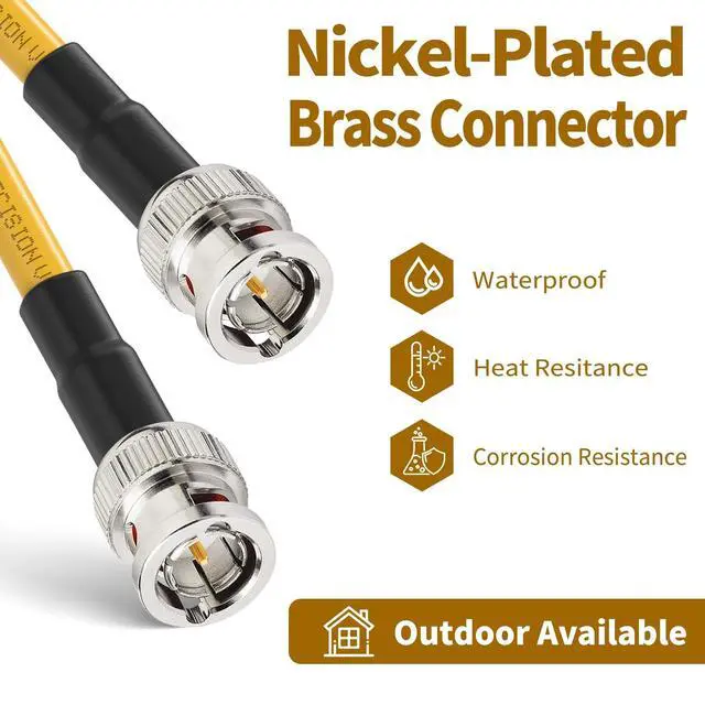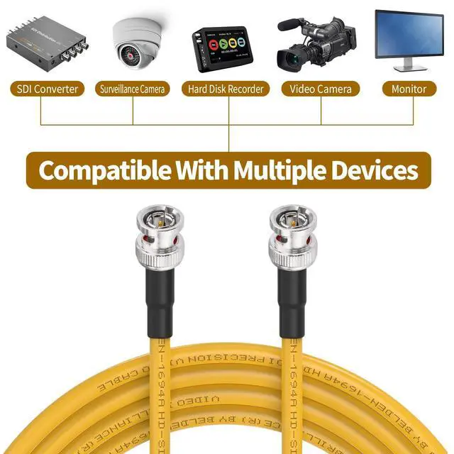 Special Connector: Gold plated ^^ This sdi camera cable is made with Belden 1694A; 18 AWG, Supports Full 3G/6G Bandwidth for 1080P, 4K Video ^^Standard Definition SD-SDI (270 Mbps, ST 259) HD standard HD-SDI ( 1.483 Gbps, ST 292) 3G-SDI ( 2.97 Gbps, ST 424) 6G-SDI ( 5.94 Gbps, ST 2081) 12G-SDI ( 11.88 Gbps, ST 2082) ^^ BELDEN 1694A PRECISION SERIAL DIGITAL VIDEO COAXIAL CABLE: features exceptionally low attenuation and a 4.5 GHz Bandwidth in an RG6 type coax cable. Featuring RG-6/U type, 18 AWG solid, good for long sdi cable, and The Jacket is made of proof-water pvc that could be used so long in the harsh environments in the outdoor. ^^ This sdi cable Is suitable for HDTV and professional