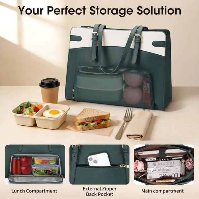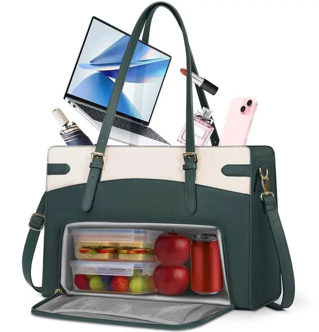 The spacious lunch compartment easily holds daily meals, fruit, and snacks, outperforming typical lunch bags. The wipe-clean lining makes daily maintenance easy, ideal for long shifts, extended commutes, and workplaces without fridge access ^^ Durable Material & Reliable DesignThe laptop tote is engineered for durability and style. The insulated lunch compartment is both waterproof and leakproof, preventing spills and food odors from reaching your laptop, electronics, and important papers, keeping personal and work items protected throughout the day ^^ Large & Multiple Pockets for One Day's NeedsThis large tote bag boasts incredible storage capacity, featuring 10 distinct pockets, including 2 internal mesh pockets designed to hold water bottles or umbrellas.