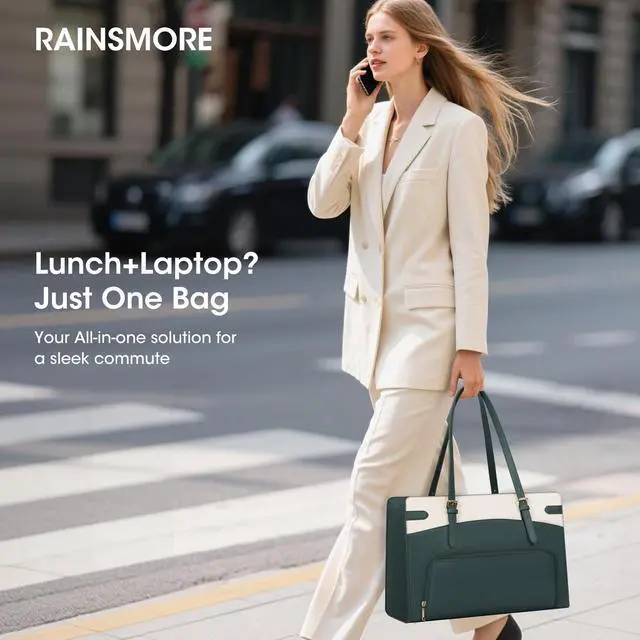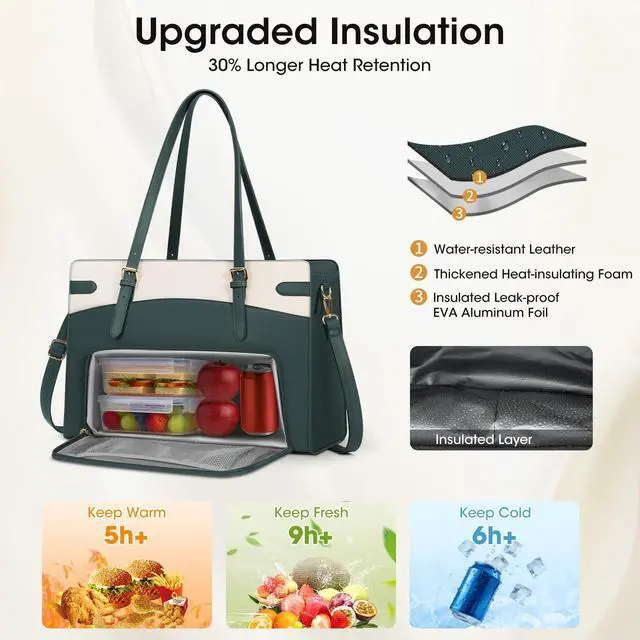 2-in-1 Work Laptop Bag with Lunch CompartmentThis RAINSMORE work tote bag for women combines your office essentials and lunch needs in one smart design. The back section fits a 15.6" laptop, notebooks, chargers, and personal items, while the front lunch compartment section keeps meals. No more carrying multiple bagsjust one laptop lunch bag with a lunch compartment for your busy day. Designed to replace both a laptop bag and a lunch bag in one professional work tote ^^ Upgraded Insulation Built for 8-12 Hour WorkdaysDesigned as a powerful lunch bag for women, this tote features an upgraded insulated liner that keeps food fresh up to 9 hours, cold drinks cold for 6 hours, and hot meals warm for 5 hours.