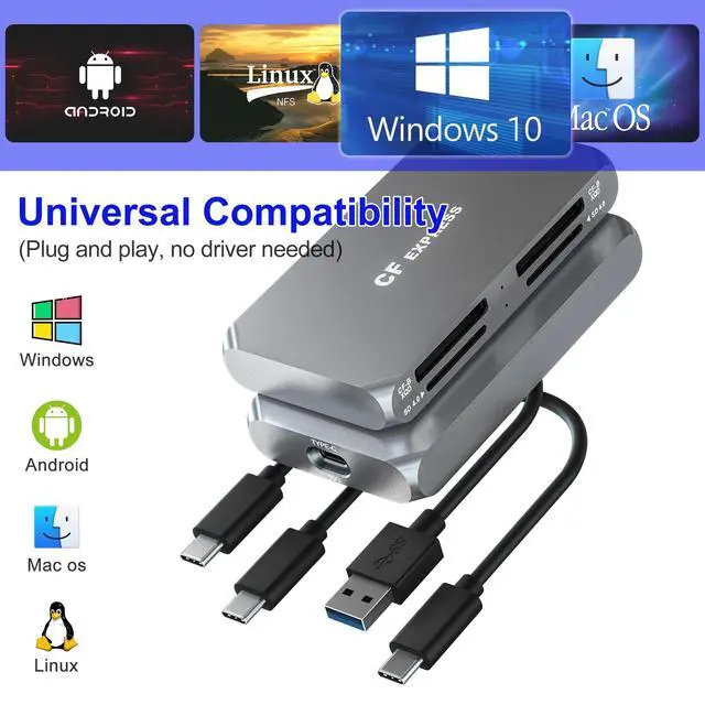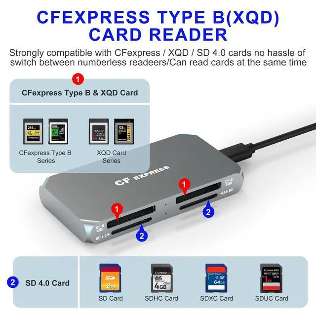 Multi-Card SupportDual CFexpress Type B/Dual XQD + Dual SD 4.0 card slots, this 4-in-1 card reader is specially designed forthose who love photography or videography and use CFexpress (Type B) +XQD+SD cards. Whats more, this card reader can read and write 4 cards at the same time, which can greatly improve your work efficiency. This CFexpress card reader is a must-have for photographers and videographers who need reliable, fast, and efficient data transfers. ^^ Fast Data Transfer with USB 3.2 Gen 2Equipped with a USB 3.2 Gen 2 Type-C interface, this CFexpress Type B reader delivers blazing-fast data transfer speeds, ensuring your high-resolution photos and 4K/8K videos are transferred in seconds.