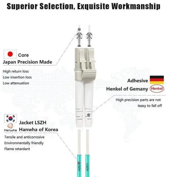 Bandwidth is 2000 MHzkm @850nm. ^^ 7.5 mm Minimum Bend Radius - High Rated 50/125um Fiber and Cladding, which is Insensitive to bending, easy peeling, easy welding, ensures small optical loss and stable transmission (insertion loss 0.3 dB, return loss 30dB. ), Ideal for SAN network cabinets that require 20 or more bends in the cabinet or high-density installations with cables crammed into an extremely small footprint. ^^ Construction Design - LSZH environmentally friendly Jacket; Adjustable connector clips allow individual fiber access; Embossed A/B position labels on the duplex clip and jacket tag rings labeled 1 & 2 provide quick identification of Tx and Rx when installing, testing, and troubleshooting equipment connections; UPC polish and Japan made zirconia ceramic ferrules with high return loss, low insertion loss, and low attenuation features, provide precise alignment to ensure the signal integrity.