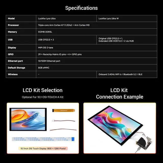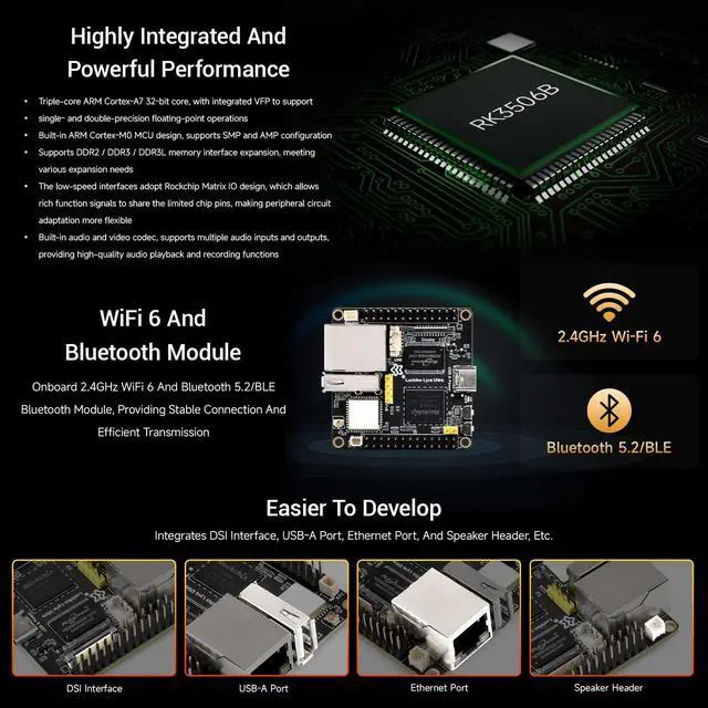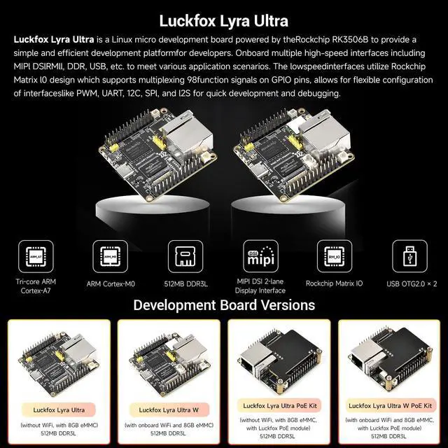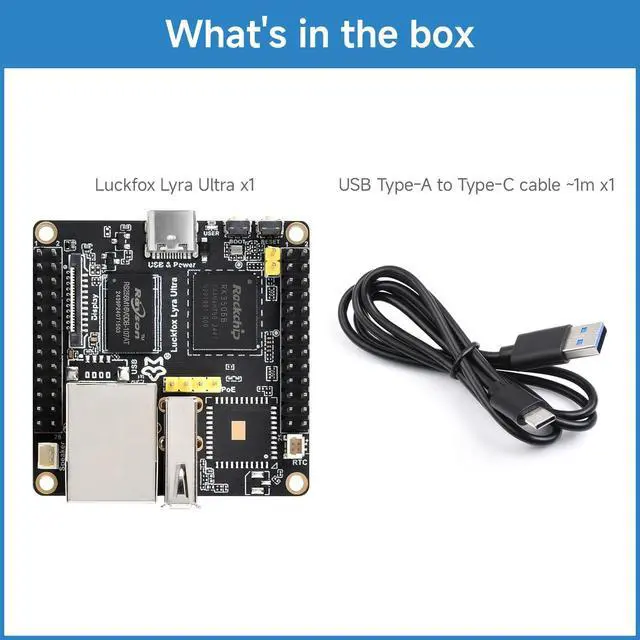 This package contains Luckfox Lyra Ultra Deveploment Board ONLY. ^^ Triple-core ARM Cortex-A7 32-bit core integrated with VFP, supporting single- and double-precision floating-point operations. Built-in ARM Cortex-M0 MCU design, compatible with SMP and AMP configurations. ^^ Supports DDR2 / DDR3 / DDR3L memory interface expansion to meet diverse expansion requirements. ^^ Low-speed interfaces feature Rockchip Matrix IO design, enabling rich functional signals to share limited chip pins for more flexible peripheral circuit adaptation. ^^ Built-in audio and video codecs with support for multiple audio inputs and outputs, delivering high-quality audio playback and recording capabilities.