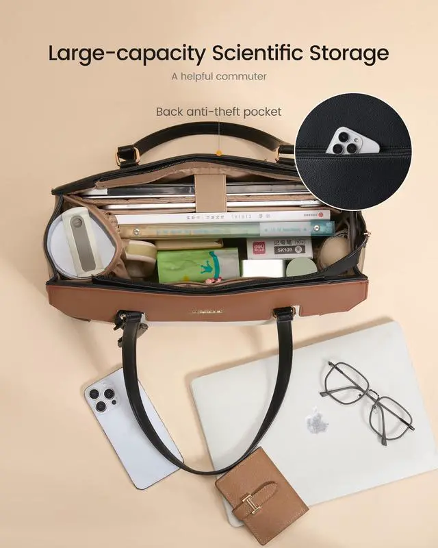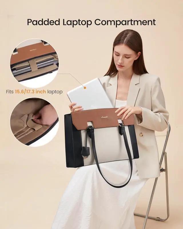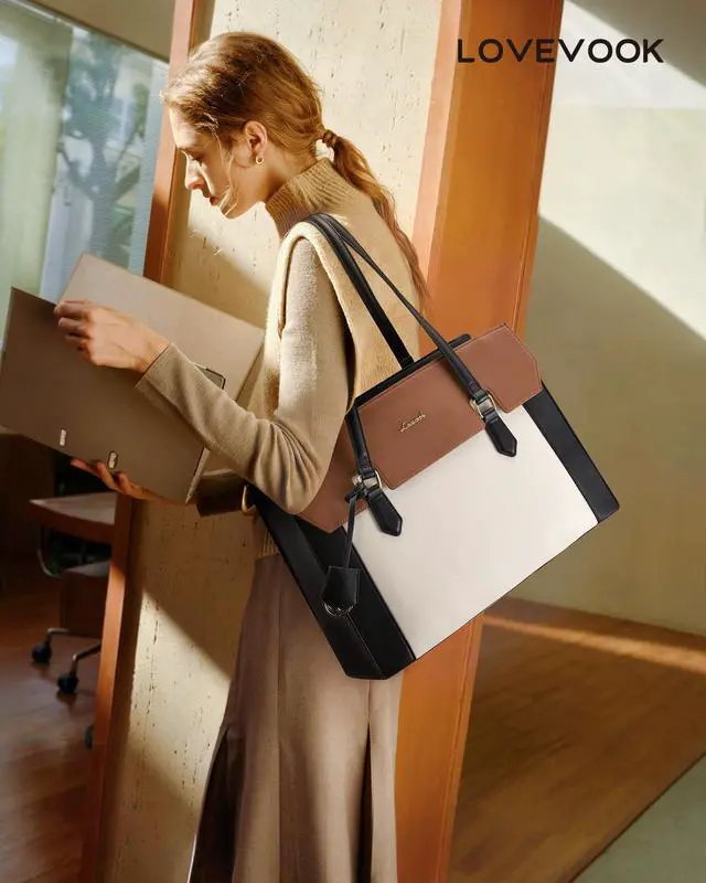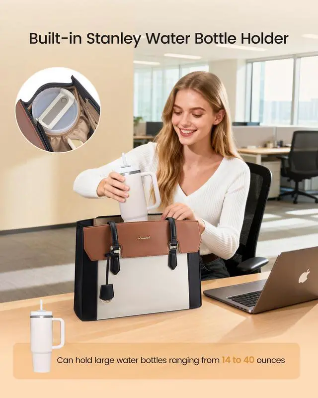Perfect Size Womens Briefcase: Size of the laptop bag is 16.25"L x 6.25"W x12"H, finished with a secure zip-top closure. You be carried in several ways as a ladies briefcase, teacher tote bag, computer bag for women, work bag as well, convenient and comfortable. ^^ Quality & DurabilityCrafted from premium PU leather with reinforced padding, this laptop tote bag provides 360 shock absorption for your 15.6 '' laptop. 4 metal base feet prevent wear and stains, ensuring your bag stays upright and professional at all times. ^^ 11 Dedicated PocketsWith 11 dedicated pocketsincluding a laptop sleeve, iPad slot, and anti-theft pocketyour A4 files, pens, and valuables stay within reach. Effortlessly organize your entire office in one stylish tote. ^^ Elastic Pocket for Stanley CupFits up to 40oz tumblers! The upgraded elastic pocket securely holds oversized bottles like Stanley cups, preventing spills and tilts. More than just a briefcase, its your thoughtful, on-the-go hydration station. ^^ Versatile for all occasionsDefining office chic with a unique tri-color patchwork design. Merging vintage charm with modern color-blocking and premium hardware, it seamlessly switches from meetings to commutes or weekend trips as a tote or shoulder bag.