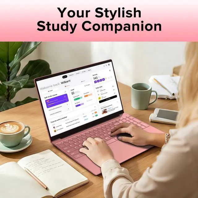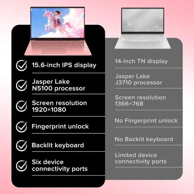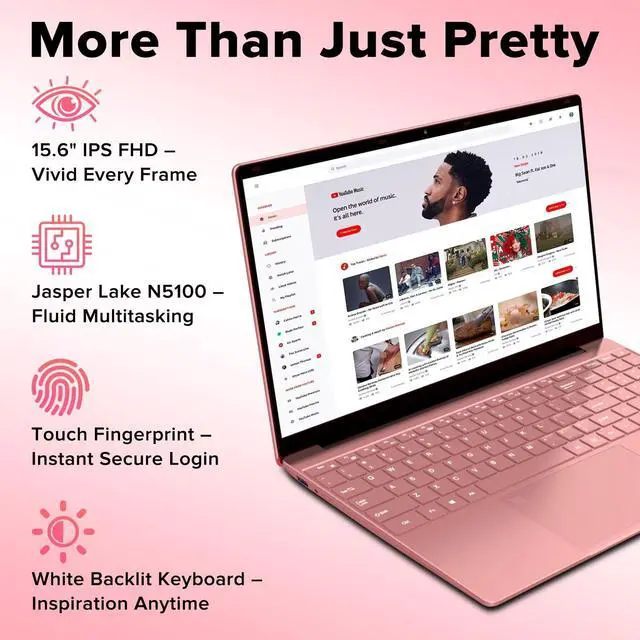 CHIC AESTHETICS & DESKTOP-LEVEL TYPING Elevate your home office or workspace with this stunning Rose Pink finish. Designed for modern professionals and students, it features a Full-Size Backlit Keyboard with a Numeric Keypad. Enjoy comfortable, desktop-level typing and blazing-fast data entry for spreadsheets, even during late-night work sessions. Plus, the 0.5 s Fingerprint Reader keeps your business files and personal data strictly secure with one touch ^^ SEAMLESS MULTITASKING FOR YOUR BUSY DAY Experience reliable computing power that keeps up with your workflow. Driven by an energy-efficient True Quad-Core Processor (up to 2.8GH z) and optimized 8GB RAM, this sleek PC easily juggles multiple browser tabs, heavy Excel spreadsheets, and Zoom video calls simultaneously without system freezing or slowing you down ^^ STUNNING 15.6" IPS DISPLAY & EYE COMFORT Upgrade your visual workspace! The crisp 1920x1080 FHD IPS Display delivers true-to-life colors and a 178 wide viewing angle.