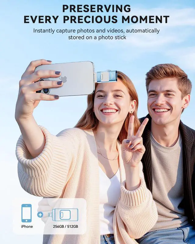 High-Capacity & Effortless Backup: With up to 256GB/512GB options, this iPhone USB storage flash drive easily handles todays larger 4K videos, high-resolution photos, and phonebook. One-click backup frees up space instantly, so youll never miss capturing important moments. Perfect for iPhone, iPad, Android and PC users.