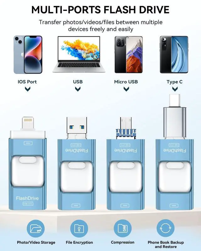 ^^ Universal 4-in-1 Compatibility: Featuring Lightning, Type-C (with separate adapters), micro USB and USB interfaces, this iphone photo storage stick connects seamlessly with iOS devices, Android OTG phones, laptops, and tablets. No iCloud fees, no internet requiredjust plug in and move files freely between your phone, computer, and other devices. ^^ Premium Build & Smart File Management: Smart flash drive made from high-quality aluminum alloy, this iPhone external storage ensures reliable performance. The dedicated app lets you view, copy, move, and delete files directly. With one-click sharing, you can easily transfer files, making it an ideal solution for freeing up iPhone storage space. ^^ Secure Your Memories with