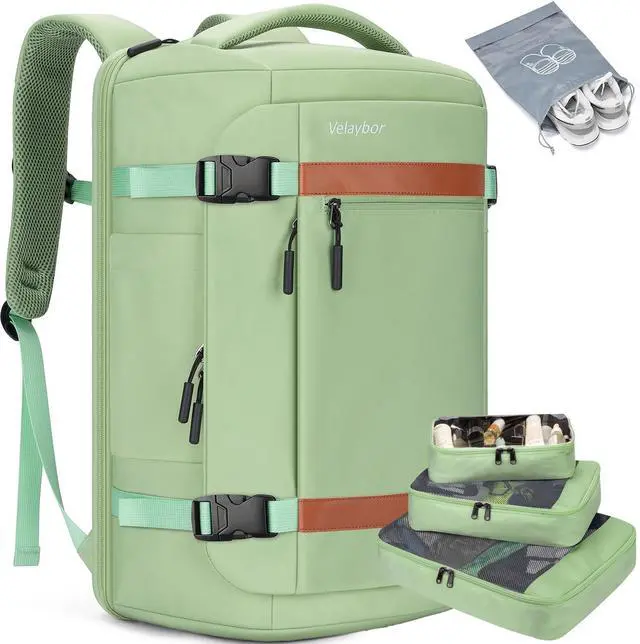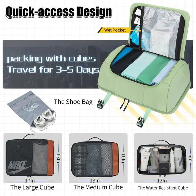 Bonus Packing Cubes: This 42L carry-on backpack includes 3 packing cubes and 1 separate shoe bag to help organize clothes, shoes, and travel gear more efficiently. The main compartment opens like a suitcase, offering large, flexible storage space for 35 days of travel ^^