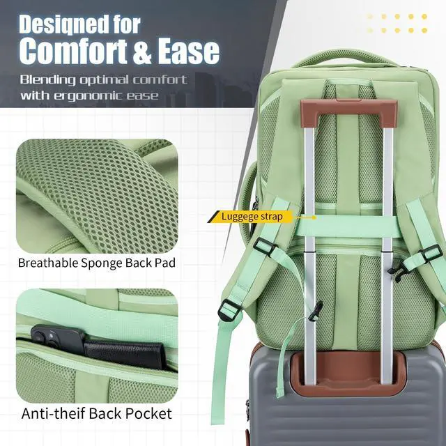 Carry & Versatile Design: Ergonomic padded back panel, adjustable chest buckle, and breathable shoulder straps reduce pressure for all-day comfort. Top and side handles offer multiple carry options. Luggage strap fits over suitcase handles