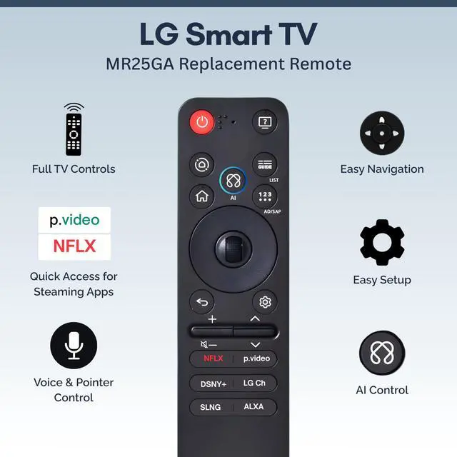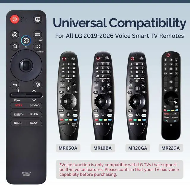 ^^ Compatible With: Most 20192025 LG webOS Smart TVs with Magic Remote & voice support, including OLED, QNED, NanoCell, and UHD models. Replaces LG Magic Remote models MR25GA, MR24GN/GA, MR23GN/GA, MR22GA/GN, MR21GA/GC, MR20GA, MR19BA, AKB75855501, and similar.