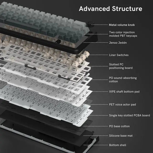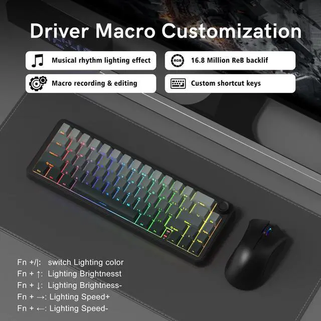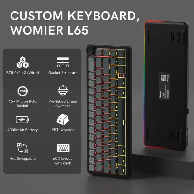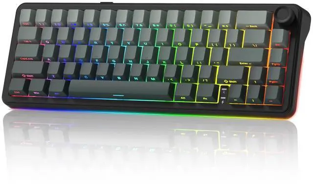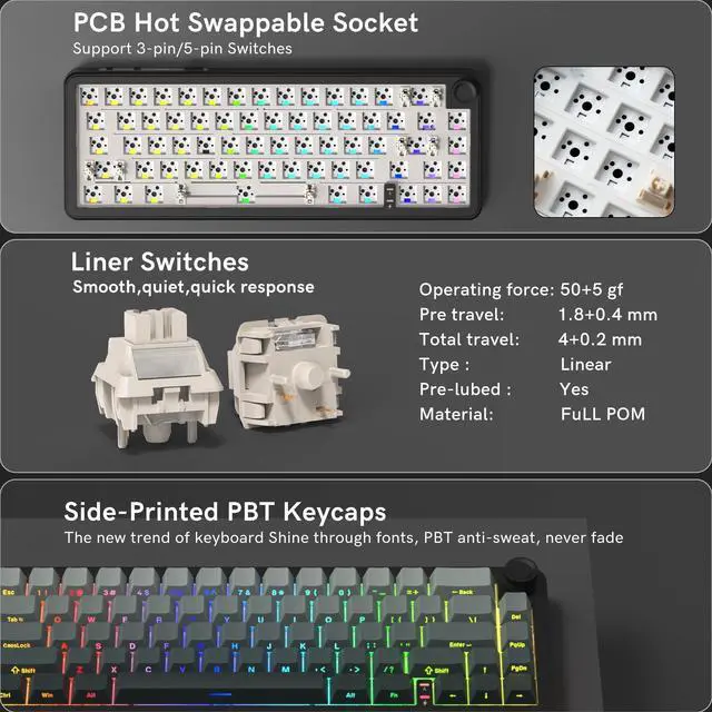 ^^ Hot Swappable Socket Custom KeyboardThis wireless mechanical keyboard comes with linear switch, pre-lubed finely-calibrated stabilizer, and 1.2 mm single key slotted PCB, better optimizes resilience and stability, making the typing feel softer and more elastic, allowing full key hot swap with most 3/5 pin switches without soldering to freely customize your keyboard and enjoy the process of building your unique setup. ^^ South-facing RGB Backlight&Shine Throug PBT KeycapsThis light up gaming keyboard can offer a preset 18 dynamic chroma backlit modes, 7 monochroma and 1 rainbow color light, effectively enhance your music or game world with cool groovy lighting effects, matched with double shot shine through gradient theme cherry profile keycaps, which provide aesthetic appearance, lasting clear characters and ergonomic typing feeling, integrated beauty and practicality.