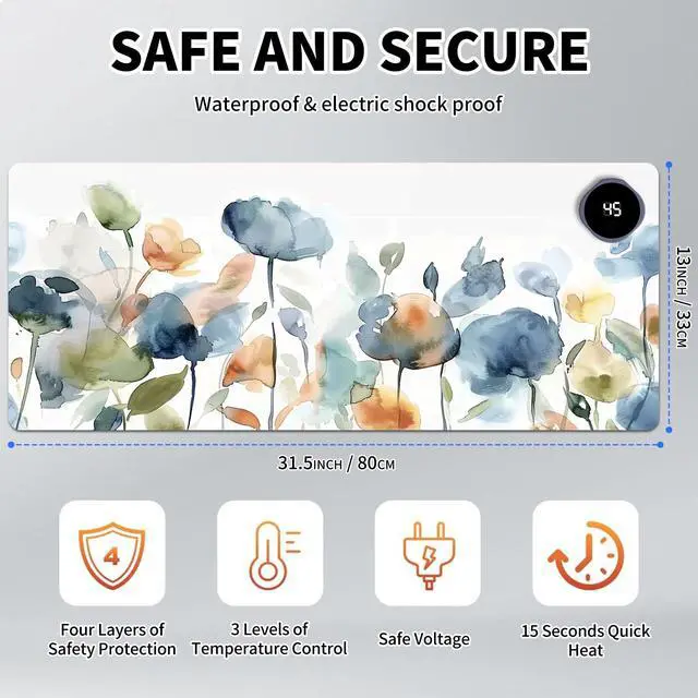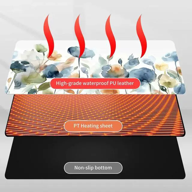 DayMulti-Functional: This warmer mouse pad also can be used as a gaming mouse mat, table warm pad, foot warmer pad, pet warmer pad. It will give you many surprises about its usage. It can keep you warmer through the cold winter. Keep warm anytime and anywhereThe heated desk mat has three temperature settings(40C, 45C, or 50C) and digital display, allowing you to customize the heat level according to your preference. The double-layer heating sheet of mouse pad enables rapid heating, just 15 seconds, you can feel significant heat. Uniform and stable heating can make your body warm anytime, anywhere in the winter.