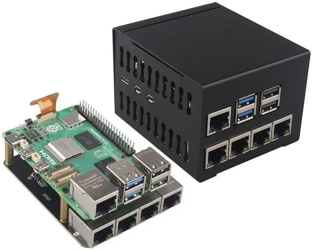 ^^ PCIe to 4 Ports Gigabit Ethernet Network HAT expansion board, provides reliable data transfer, able to achieve high-speed reading/writing. Drive-free under Raspberry Pi official OS and OpenWrt system. When use Ubuntu system, it needs to install driver. ^^ The enclosure is specifically designed for ZP597 shield with 4 Ethernet Ports. It is made of lightweight and durable metal material, which can offer excellent protection and heat dissipation for the Raspberry Pi 5 board and expansion board.