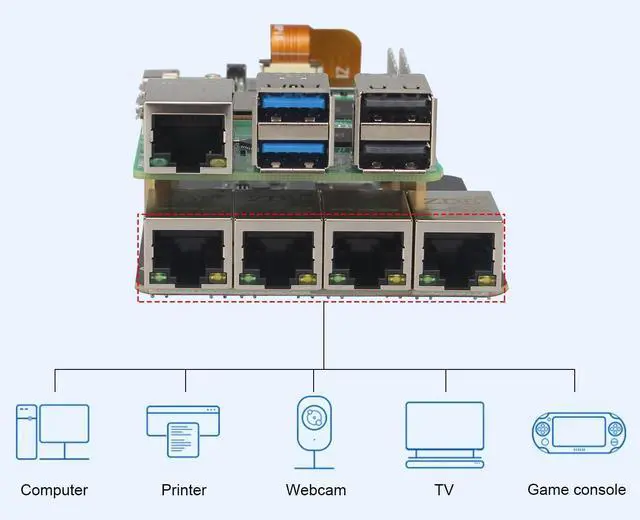 This kit includes a ZP597 PCIe Peripheral Board and a metal case. It is compatible with the latest Raspberry Pi 5 2GB/4GB/8GB/16GB board. ^^ The ZP597 is a 4 ports gigabit Ethernet network expansion board specially designed for Raspberry Pi 5, adding 4 1GBE network ports for Raspberry Pi 5. ^^ Use these 4 ports as LAN port and the network port that comes with the Raspberry Pi 5 as a WAN port, so that you can build your own router or switch with the Raspberry Pi 5. The adapter board can also be used to other multi-network port applications, such as Robot, Smart Home, VOIP, Industrial Equipment and more.