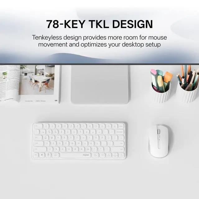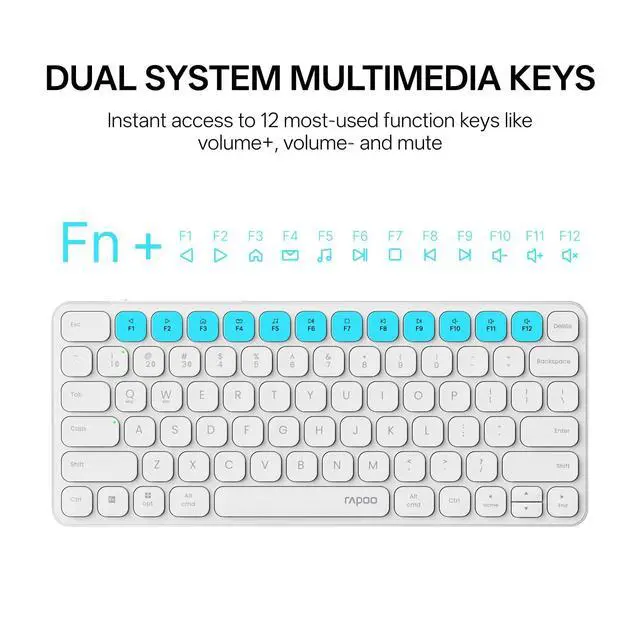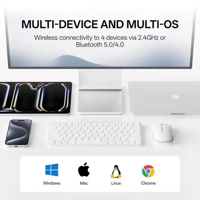 Multi-Device and Multi-OSBoth keyboard and mouse are fully multi-device and multi-os friendly for powering through projects on 4 devices at the same time --- driver-free, plug and play. ^^ Reliable Wireless ConnectivityFeaturing 2.4GH z/Bluetooth 5.0 / 4.0, this wireless keyboard and mouse combo open up new ways to type on your PC, tablet, phone or a second computer. ^^ Adjustable DPIIncludes optical 800/1000/1200/1600/2400 resolution mouse for silky prominent movement on different sized displays. ^^ Silent Click and Dual System HotkeyThe low-profile chiclet scissor keys provide comfortable, quiet typing experience for hours at your desk; Support Windows and Mac OS dual system shortcuts to 12 widely used functions keys like play/pause, volume+/- and more.