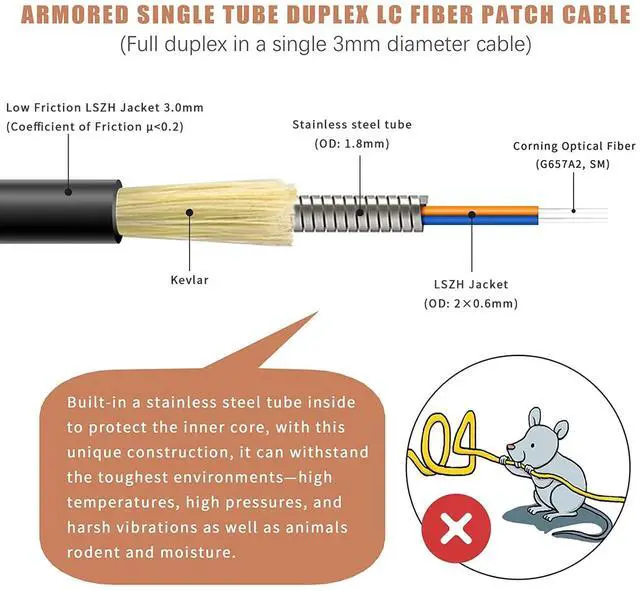 • Armored Fiber Optic Cable can be used outdoor: This LC fiber jumper cable built-in a stainless steel tube inside to protect the inner core(fiber glass) from damage like pet chew. it remains all the features of a standard patch cord, but is much stronger. Pressure resist, Wear resist and Heat Resist.