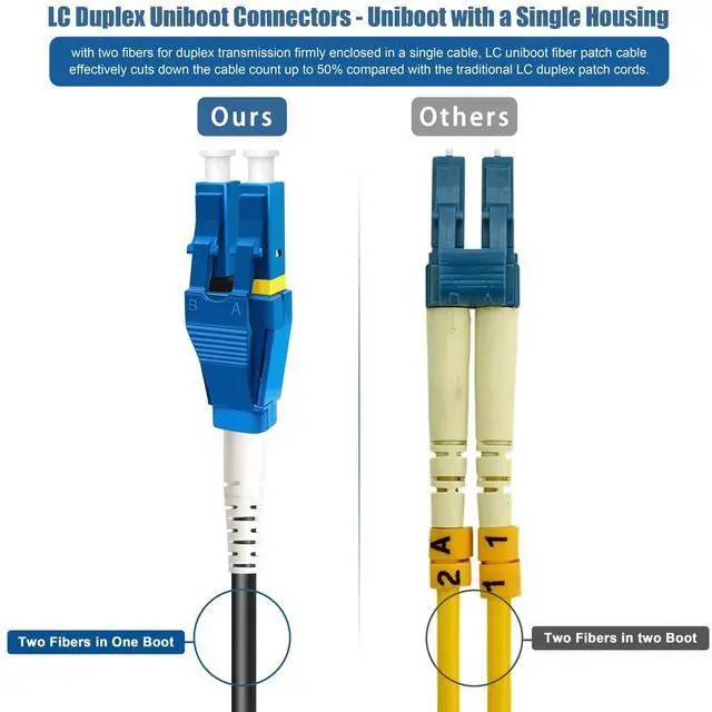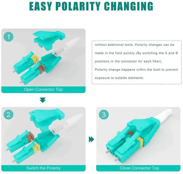 Connectors - Space-saving: LC duplex connector with uniboot is two LC connectors encased in a common housing with one boot, terminated on a single twin-fiber round cable. By using cable assemblies with LC Uniboot connectors, half of the space can be saved over traditional duplex cable. Uniboot single jacket patch cables make patch panel cable management becames considerably easier. Ideal for high-density cabling application. ^^ Reversible Polarity of Uniboot Connectors - easy polarity changing: Unlike common LC patch cords, this switchable uniboot cable supports the polarity to be switched without connector re-termination. Polarity changes can be made in the field quickly (By switching the A and B positions in the connector for each fiber), without the use of tools, to the correct fiber mapping polarity. No damage to fiber.