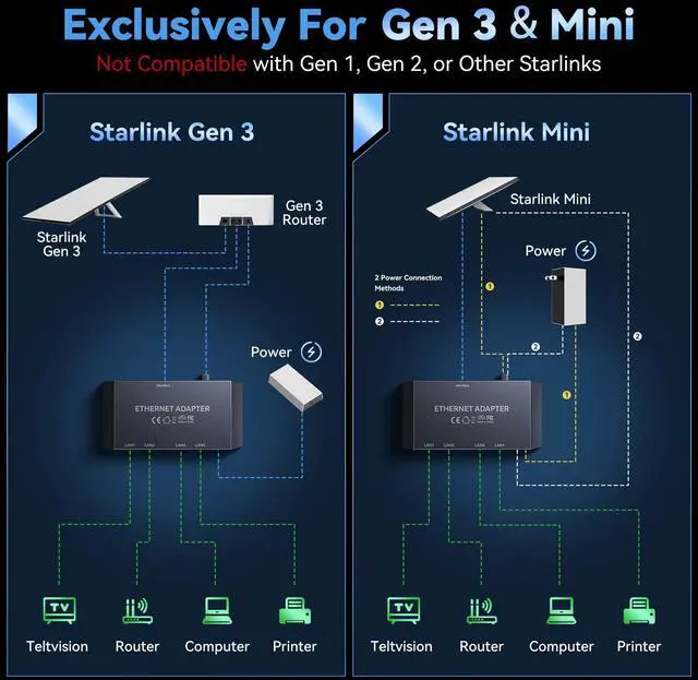 [Works with Gen 3 and Mini Routers] Made specifically for current Starlink Gen 3 and Mini models lets you add wired internet to your setup without compatibility worries ^^ [Connect 4 Devices Together] The Starlink Gen 3 Ethernet Adapter has 4 gigabit ports that let you plug in computers game consoles smart TVs or work laptops all sharing the same fast Starlink internet at once ^^ [Keeps Speeds Steady for Everyone] The Starlink Ethernet Adapter Gen 3 is built to handle multiple devices streaming gaming or video calls at the same time so nobody gets stuck with buffering or lag ^^ [Truly Plug and Go] The Multi-Port Starlink Ethernet Adapter is easy to connnect.