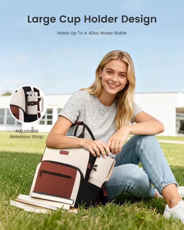 Large Water Bottles: Equipped with two elastic side pocket capable of holding large water bottles or thermoses up to 40oz, this backpack ensures you stay hydrated throughout your busy day. The innovative cup holder design keeps your bottle stable, preventing spills while providing easy access whenever you need a drink. Whether commuting, working, or traveling, it's the perfect companion for staying hydrated hands-free. ^^ Ample Storage with