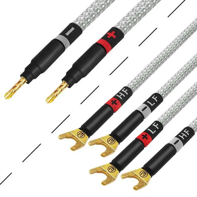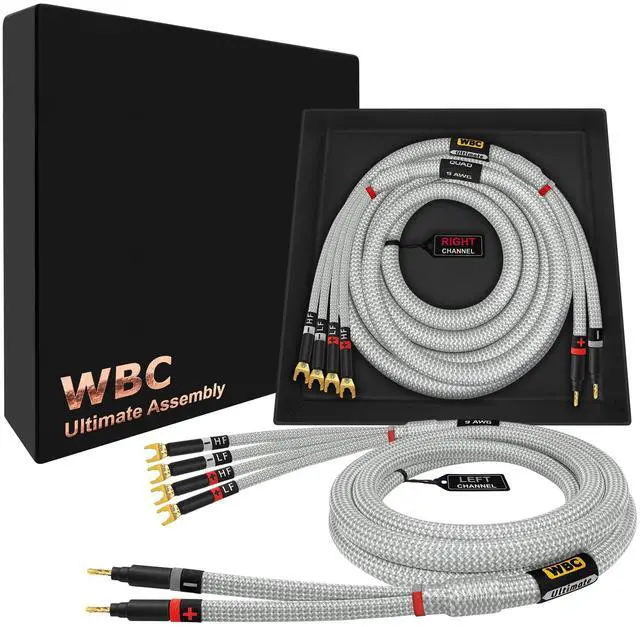 The high-end packaging, makes these a great gift for any Audiophile or Music Lover who will appreciate handcrafted, high quality audio cabling. The braided Tweed cloth jacket and embroidered labeling will compliment your high-end gear quite tastefully; this is truly The Ultimate speaker cable. ^^ At WBC we only use the highest-grade connectors for these audiophile cable assemblies. Eminence 3 micron, 24K Gold plated, audiophile-grade, 4mm (standard diameter) banana plugs with a fully insulated body to prevent accidental shorting & multi-spade connectors, (compatible with 8mm and 6mm binding posts), provide superior abrasion & corrosion resistance and unrivalled performance.