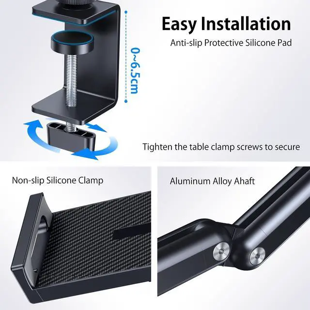 ^^ 360 Rotation: The connection between the table clamp and the bracket arm can be rotated 360 degrees which allows for convenient and flexible adjustment of the direction without reinstalling. The top of the tablet bracket adopts a ball joint, which can freely adjust the angle of the clamp, allowing you flexibly adjust the viewing angle to obtain the most comfortable viewing angle.
