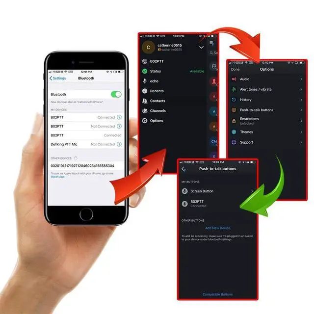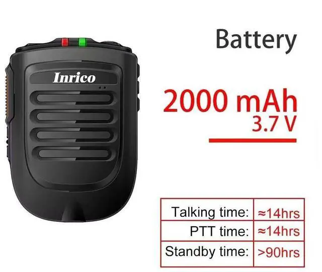 *Big PTT*Group switch*Wireless Microphone work with realptt, with zello, push to talkBluetooth version 4.2B luetooth protocol HFP / HSP / A2DP / AVRCP / SPPTransmission range 10mTransmission power CLASS24dbmbr> Audio performance SBC DecodeAudio to Noise ration ge75dBSpeaker power 1W/8R116dBLED indicator Blue/Green LED IndicatorEarphone jack 3.5 mmsupport PPT earphoneBattery capacity 2000mA/ 3.7VS ize 63* 25.6 *90
