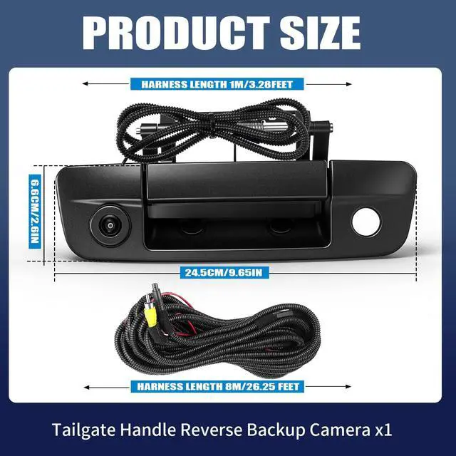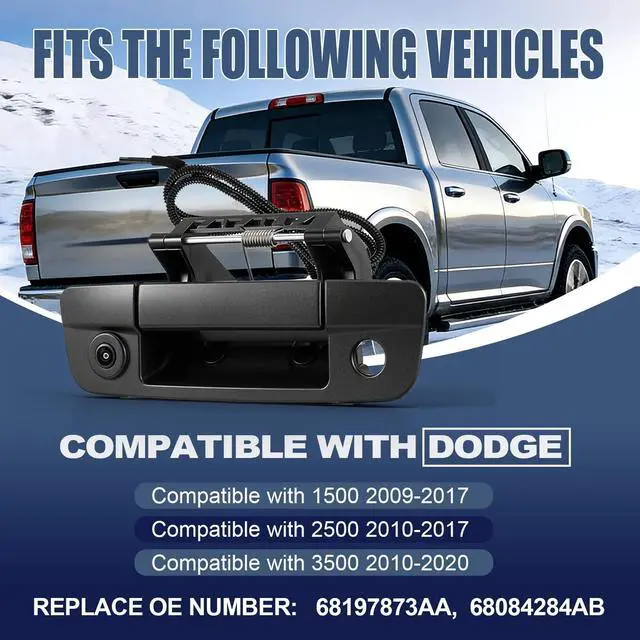 Compatibility for Replacement The aftermarket tailgate backup camera fit for Dodge Ram 1500 2009-2017, fit for Dodge Ram 2500 2010-2017, fit for Dodge Ram 3500 2010-2017 ^^ Replaces Part OE Number 68197873AA, 68084284AB Backup Camera will meet or exceed OEM standards. Direct replacement for your original camera - plugs right in with no wiring changes needed. ^^ 170 ultra-wide view with HD Picture170-degree super wide angle lets you see much more than regular cameras. 720p HD resolution gives you a sharp view. Equipped with low-light sensitive elements, it can capture clear images in low-light conditions ^^ IP68 Waterproof, Works in Different WeatherFully sealed against rain and snow.