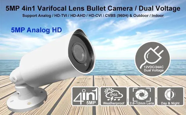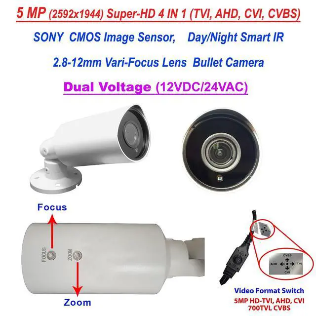 4 IN 1 (HD-TVI, HD-AHD, HD-CVI, CVBS (1000TVL) HD technology produces 5MP Analog HD Video with Sharp and Detailed Images ^^ 1/ 2.8" 5MP CMOS Image Sensor, 5Megapixel (2592x1944) Resolution; 3D Mounting Bracket; Dual Voltage DC 12V/650mA, AC 24V/ 3.4W; 2.8 -12 mm Variable Focus Wide Angle Lens; 6 pcs IR Infrared LED Smart IR for night vision and 100ft IR range ^^