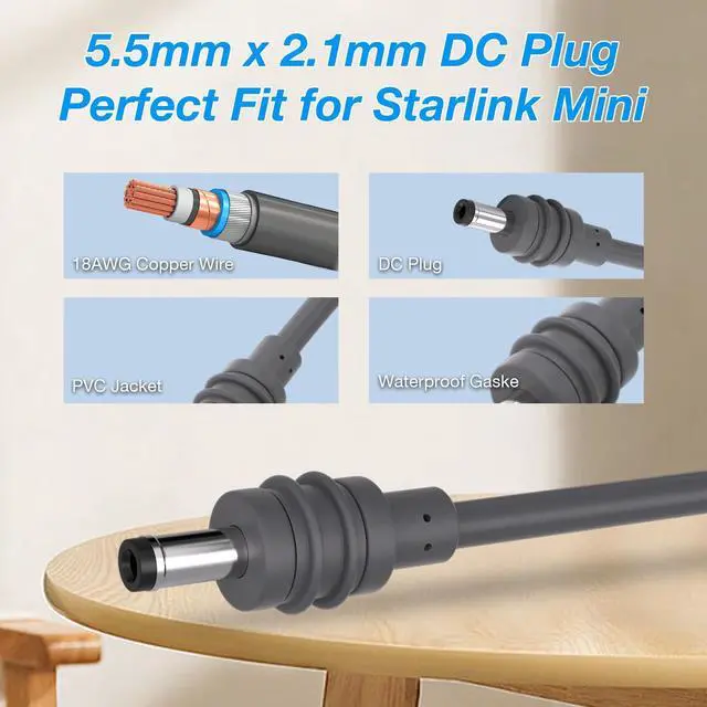 Cable: Featuring a 5.5 mm x 2.1 mm waterproof DC plug and a flexible 3.2 ft 18AWG cable, the Starlink Mini Car Adapter allows quick, tool-free installation in RVs, trucks, boats, and camping setups