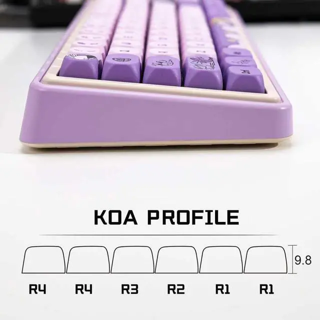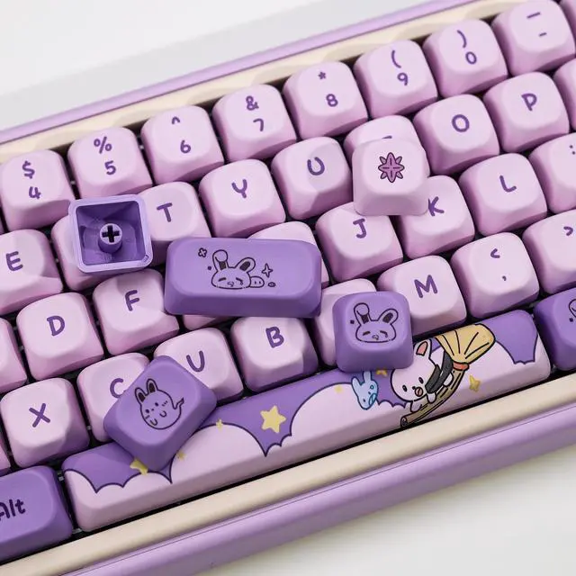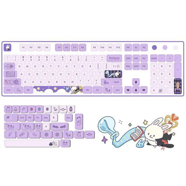KBDiy KOA Profile-KOA Profile similar to MOA Profile, Ergonomic Arc layout, concave arc, fingers contact the keycaps in a larger area, the touch is smoother, making you feel more comfortable when using ^^ Accessories Included-This keyboard keycap set consists of 139, Keycaps do not include the keyboard. The keyboard in the picture is for display purposes only. Orange, Light Purple keycaps make up the Magic Bunny series, you can DIY your own unique keyboard ^^ Dye Sublimation PBT Keycaps-The patterns on the keycaps use dye-sublimation technology to never fade.