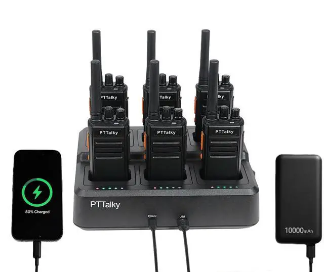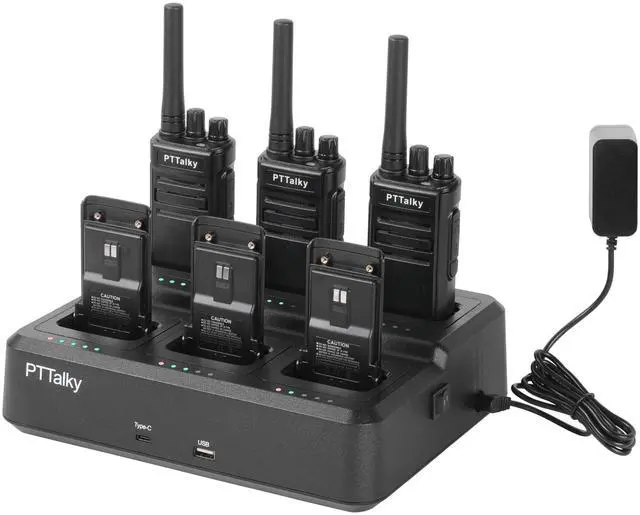 More Efficient, Easier Management. PTTalky FR1 walkie talkies with six way charger, durable, portable and convenient.