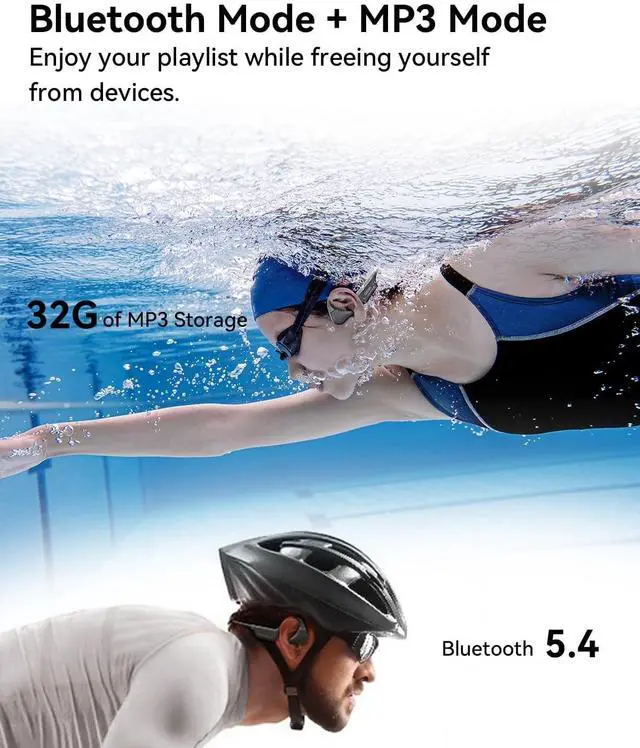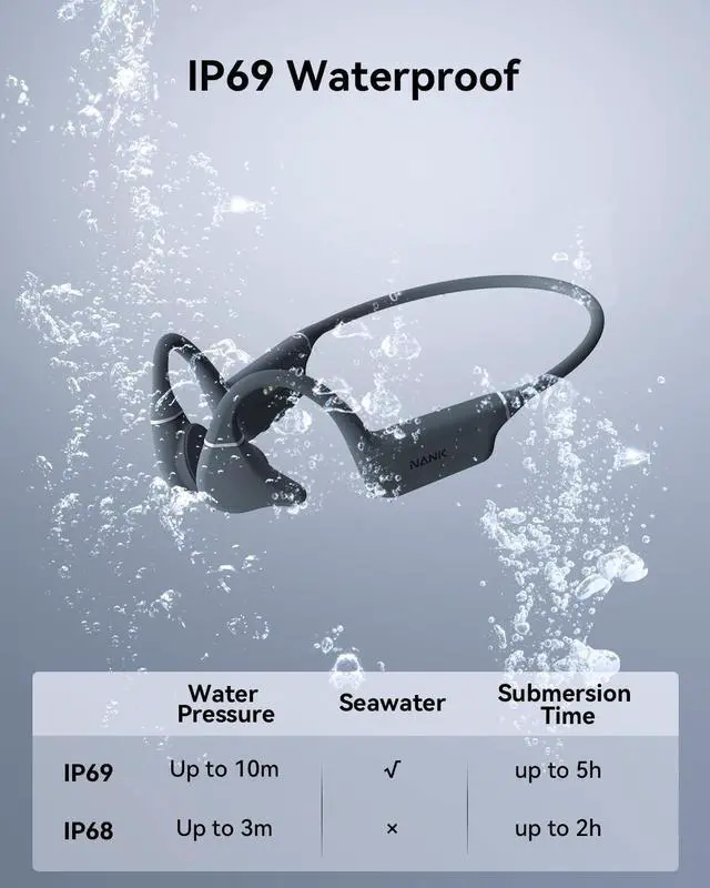 Groundbreaking Innovation "The wind noise drowns out my bone conduction headphones when I'm biking. " "It's tough to hear my headphones clearly in a noisy pool! " The innovative noise-canceling reduction mode of NANK bone conduction headphones will solve these problemsNote: Swimming use MP3 mode and turn off your phone's bluetooth ^^ IP69 Waterproof for All-Weather UseNANK Runner Diver2 Pro swimming headphones are IP69 waterproof certified, featuring nano-coating and ultrasonic welding technology for swimming and diving in various conditions. These headphones support continuous underwater operation for up to 5 hours at 10-meter depthsNote: Swimming use MP3 mode and turn off your phone's bluetooth ^^ Open-Ear & Noise-Canceling ModeOpen ear swimming underwater headphones features a pioneering 35 adjustable ear hook design, you can freely switch between open-ear and noise-canceling modes by adjusting the angle of the ear hooks. Enjoy clear music whether in a quiet or noisy environment ^^ Bluetooth 5.4 with MP3 PlayerRunner Diver2 Pro can be used as bluetooth headphones or as an MP3 player with built-in memory. Bluetooth 5.4 pairs easily with iOS and Android devices. Triple tap to switch to MP3 mode and store enough songs with 32GB of memory (Comes with Three Songs) ^^ Comfortable WearThe swimming earbuds for are designed with ergonomic memory elasticity, every angle is meticulously crafted for comfort. The streamlined design ensures a secure fit during any activity. The adjustable ear hook design makes the bone conduction earbuds compatible with swim caps, goggles, or helmetsSilicone Adjustment Strap to Adjust the Tightness of the Headphones ^^ 10-Hour Battery LifeRunner Diver2 Pro swimming bone headphones with the Fast Charge technology, charge for 10 minutes and get 120 minutes of playtime. The headphones offer a 10-hour super-long battery life, keeping the music going through your long workouts ^^ After-Sales ServiceIf you have any questions during use, please contact us immediately.