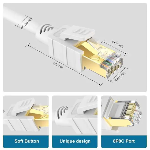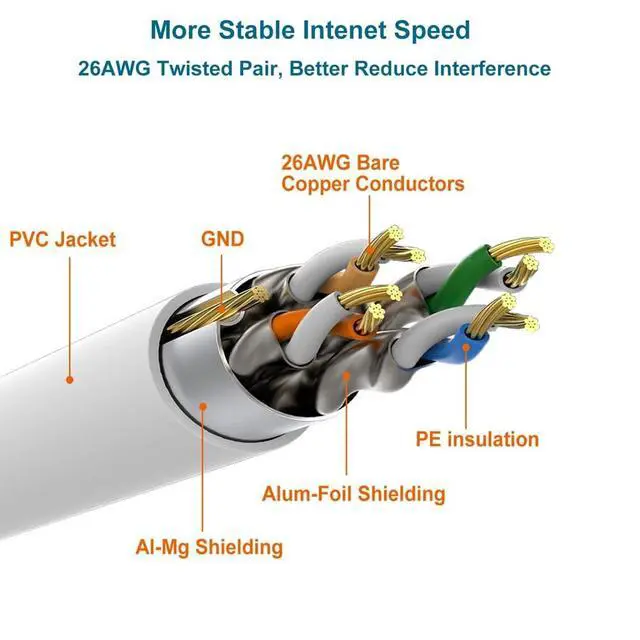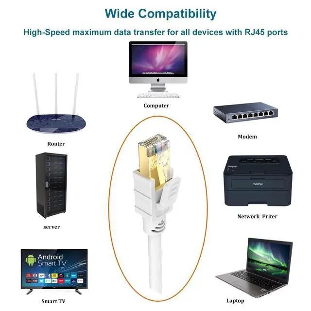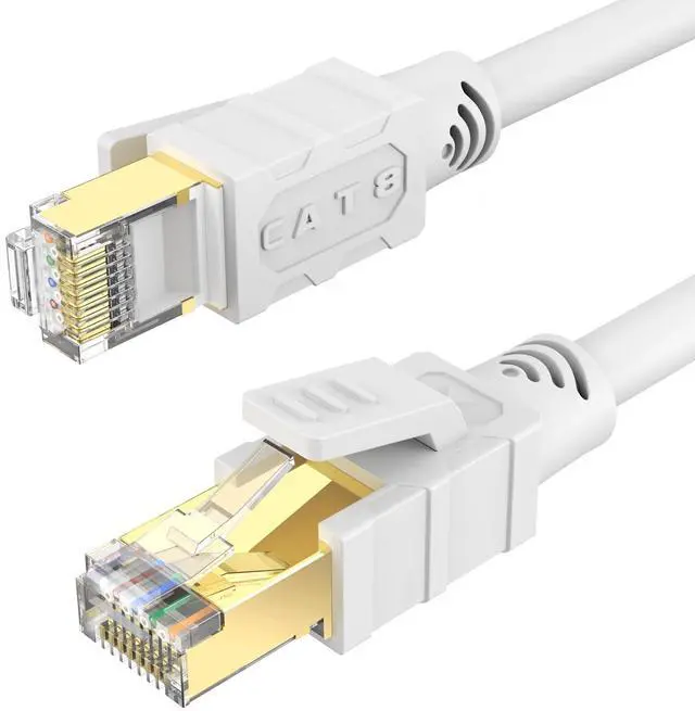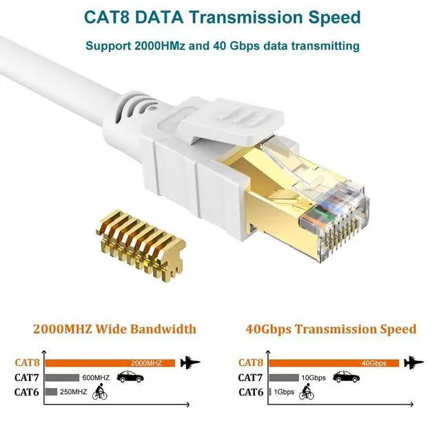 Supports bandwidth up to 2000MHz & transmitting data at speeds of up to 40Gbps; Connects to LAN/WAN segments and networking gear at maximum speeds; guarantees high-speed data transfer for server applications, cloud computing, and HD video streaming. ^^ Backwards compatible with CAT5, CAT5e, CAT6, CAT6a and CAT7 equipment; Perfect for Laptop, Router, Modem, Switch, Hub, DSL and network attached storage devices, PS2, PS3, PS4 and game boxes with RJ45 ports. ^^ Made of 4 shielded twisted pair of copper wires with two RJ45 connectors on each end; The Double Screened Shielded Twist Pairing (SFTP) design and connectors with 50 micron gold plated contact pins confidently protect the cable from external Electro-Magnetic Interference (EMI) for optimized signal quality.