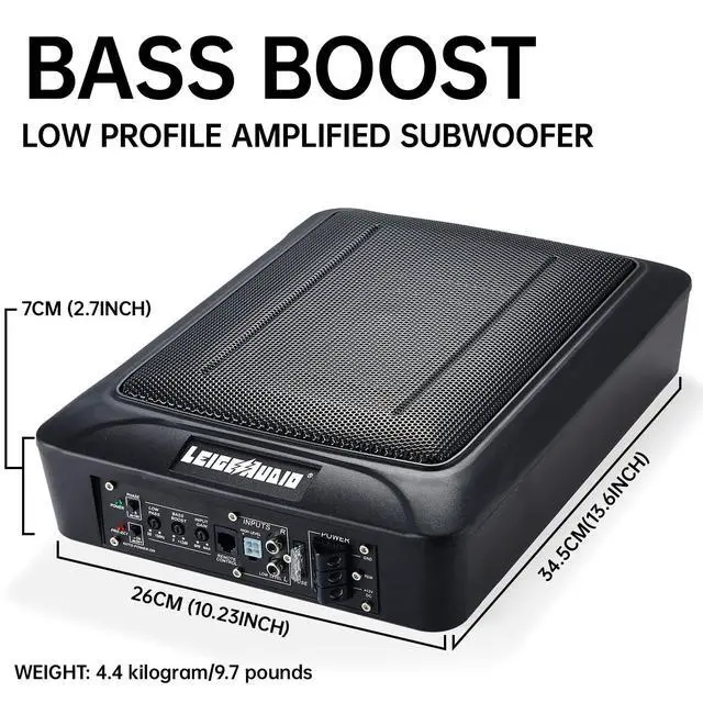 Peak: 800 watts. ^^ The compact size measures just 11 L x 7.5 W x 2-3/4 D so it can be installed under or behind a seat in a truck, in a sedans trunk or in an SUVs hatch. ^^ PWM MOSFET Power Supply/Thermal Protection Circuit Remote Subwoofer Control Included RCA and High-Level Inputs. ^^ Small Package but Powerful Sound, and Comes with wired remote to control all the bass from the Drivers Seat. ^^ VARIABLE BASS BOOST - 0 - +12 dB