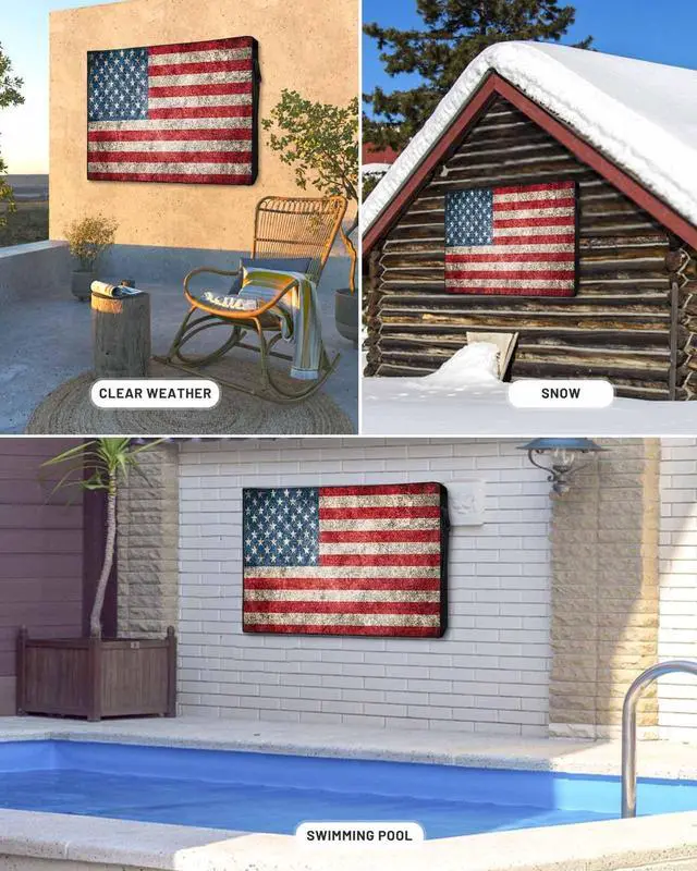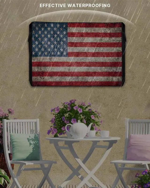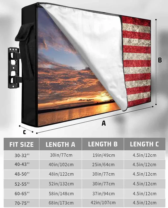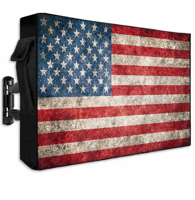 American Flag Outdoor TV Cover for 40 to 43 Inch is a great option for those who want beautiful outdoor decoration and all-round protection without rain/snow/falling leaves onto TV. Outdoor TV Enclosure Detail1. TV screen protector for outside is composed of a sturdy 600D Oxford fabric that protect the device from direct sun, morning dew and the occasional sideways rain. 2. The high density woven flat screen TV cover protector has waterproof linner of PVC materical. Snugs up the TV nice, no issues with rain intrusion. 3. Patio tv cover has high-quality zippers on both sides and a triple stick straps fastening design on the back to ensure that the TV cover can remain strong even in the rain.