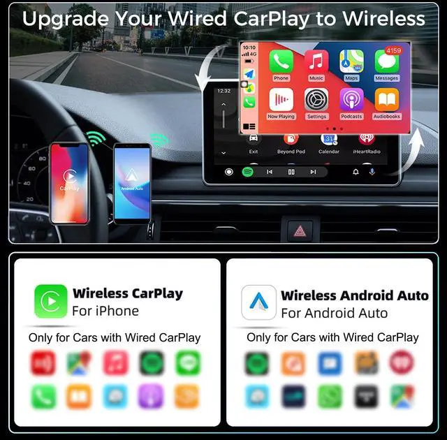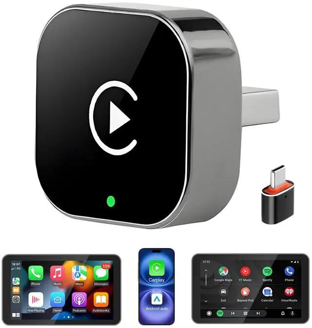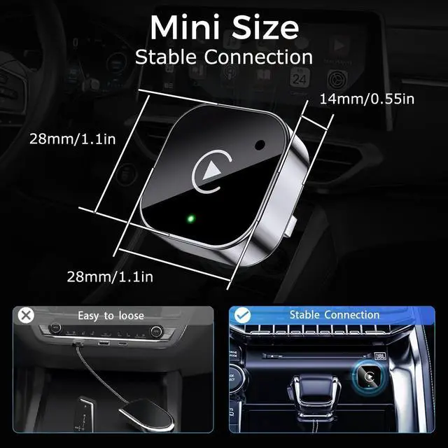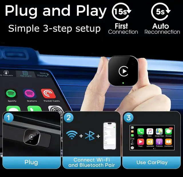 Enjoy navigation, Spotify/Apple Music streaming, hands-free calls, and voice commands for safer driving and a clutter-free dashboard(Note: Your vehicle must be equipped with built-in wired CarPlay or Android Auto support) ^^ Effortless Plug & PlayThe wireless apple carplay adapter only need 3 simple step setupNo additional any extra drive, apps, or troublesome system upgrades are required. After first connect, it will automatically reconnect to your phone, even if it is in your pocket, backpack, or outside the car. Makes the entire experience smoother, noiseless, and zero latency. Streamline your driving! ^^ Compact and Stable The mini wireless CarPlay adapter is equipped with a powerful chip, providing fast and stable wireless connection while reducing interruptions and delays during use. It offers the same reliability as wired connections, but without the wires. ^^ Friendly Reminder 1If you meet unstable or disconnected connections during use, address