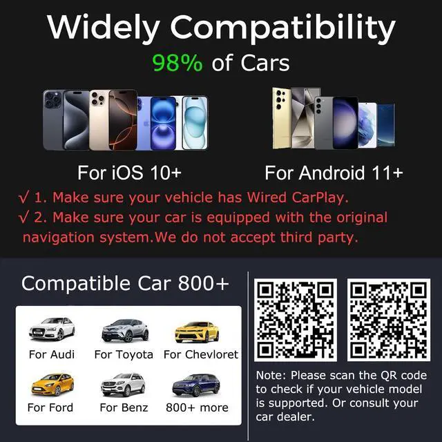 Important Tips Before Buying This adapter is exclusively for cars with factory-wired CarPlay/Android Auto (Not support Tesla) make sure your vehicle meets this requirement first! It supports new versions running iOS10 and above, updated models above iphone6, and Android smartphones that support the latest Android auto function. Android 11 or later is required. It includes a Type-C adapter to ensure compatibility with the USB and USB-c ports of various vehicles and devices, It supports over 800 vehicle models (Do not purchase if your car does not have CarPlay/Android auto built-in. ) ^^ Effortless Wireless CarPlay ExperiencerUpgrade Wired to Wireless in seconds - Instantly convert factory CarPlay/Android Auto systems without cables (Please use the data port instead of the charging port).