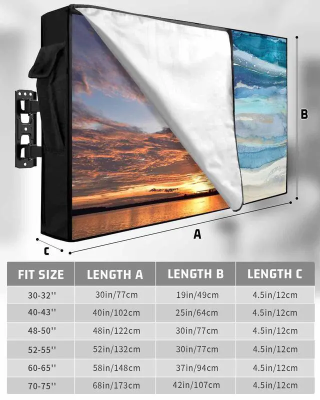 Inch- Outdoor TV cover size: Outdoor TV cover measures 68"L x 42"H x 4.5"D, Perfectly compatible with TVs with diagonal lengths between 70" and 75", please confirm your TV's size before purchasing. - High quality
