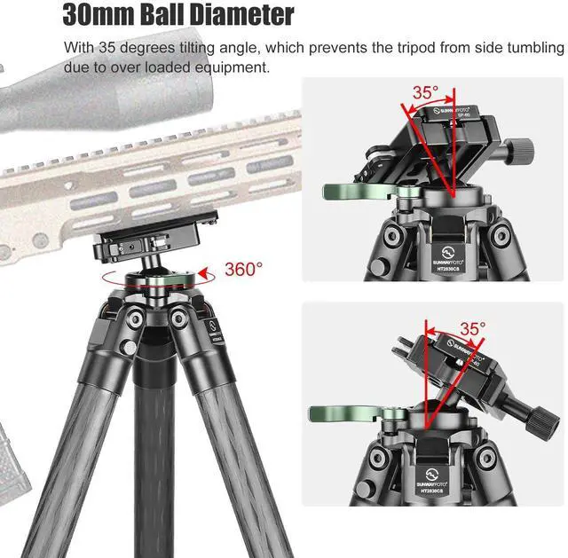 Ball diameter 30mm, with 35 degrees tilting angle, which prevents the tripod from side tumbling due to over loaded equipment.