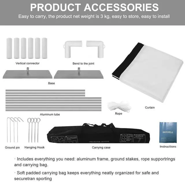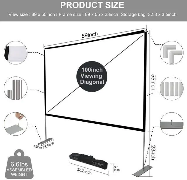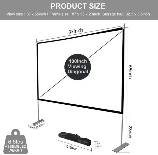 Movie Screen Outdoor outdoor projector screen and stand, 4k HD 16:9 Ratio, the foldable movie screen is designed for providing sharp and high-resolution images, enriched colors and supreme watching experience from different viewing position. ^^ Easy to InstallYou can easily complete the installation within 5 minutes without any tools according to the instructions of the screen for projector. If you encounter windy weather, you need to use the ropes, nails, and water bags we provide to secure it. You can perfectly enjoy your outdoor movie time ^^ Convenient to CarryThe portable projector screen is equipped with a handbag.